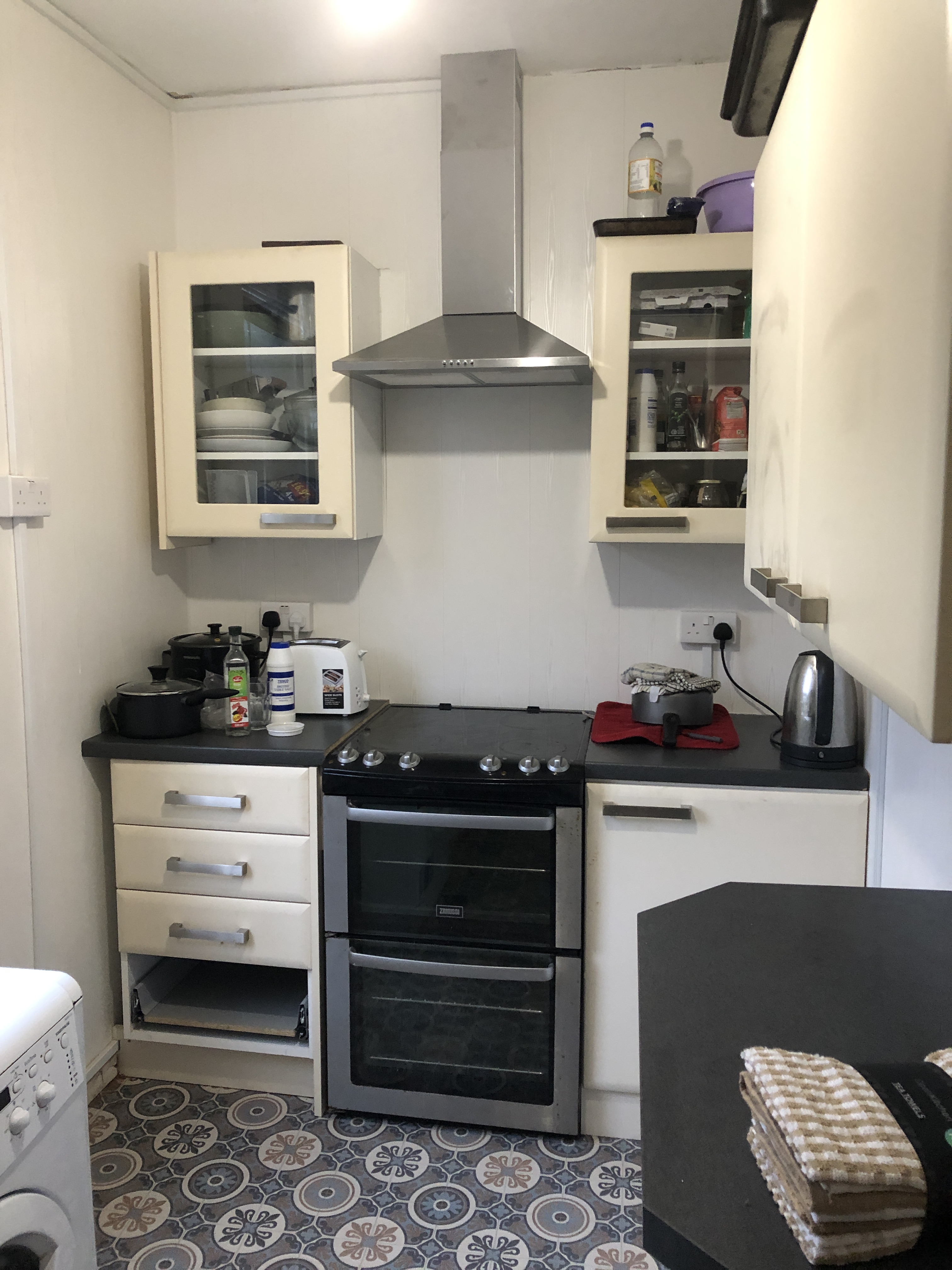 The kitchen is equipped with washing machine and plenty of fridge and cupboard space.